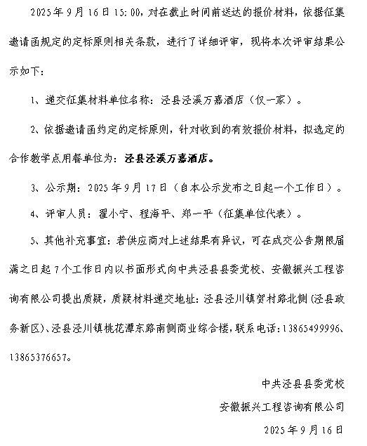 中共泾县县委党校现场教学点用餐合作单位(增补)征集结果公示